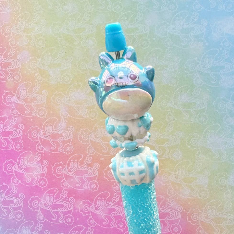 This beaded pen is perfect for adding whimsy to your desk. It writes in black ink and uses a twist feature to release the ballpoint for writing.