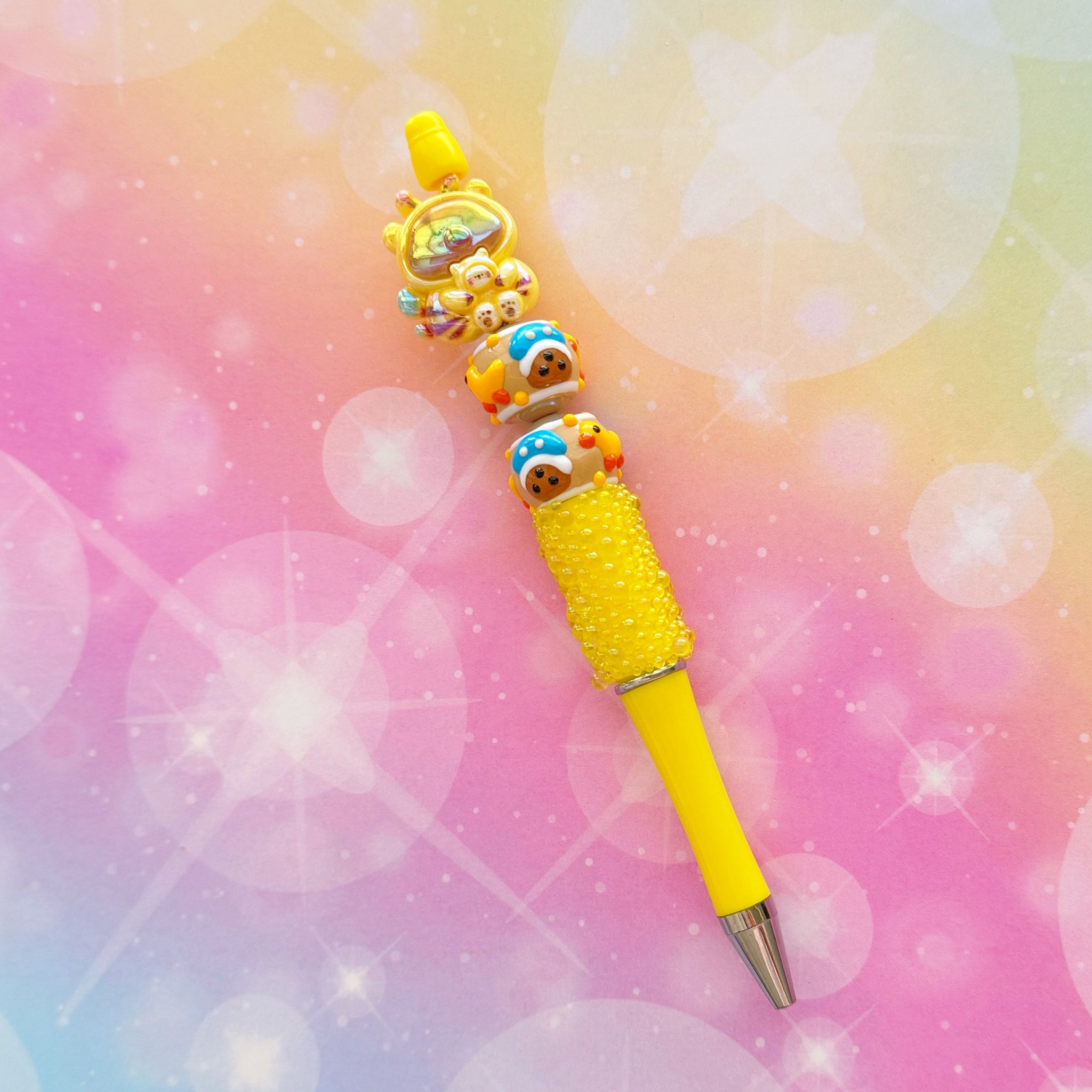 This beaded pen is perfect for adding whimsy to your desk. It writes in black ink and uses a twist feature to release the ballpoint for writing.