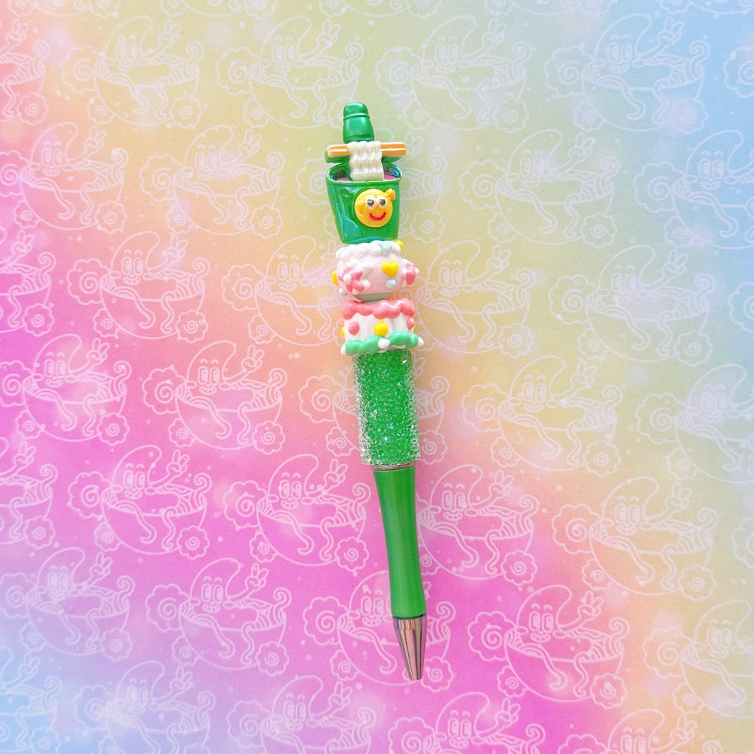 This beaded pen is perfect for adding whimsy to your desk. It writes in black ink and uses a twist feature to release the ballpoint for writing.
