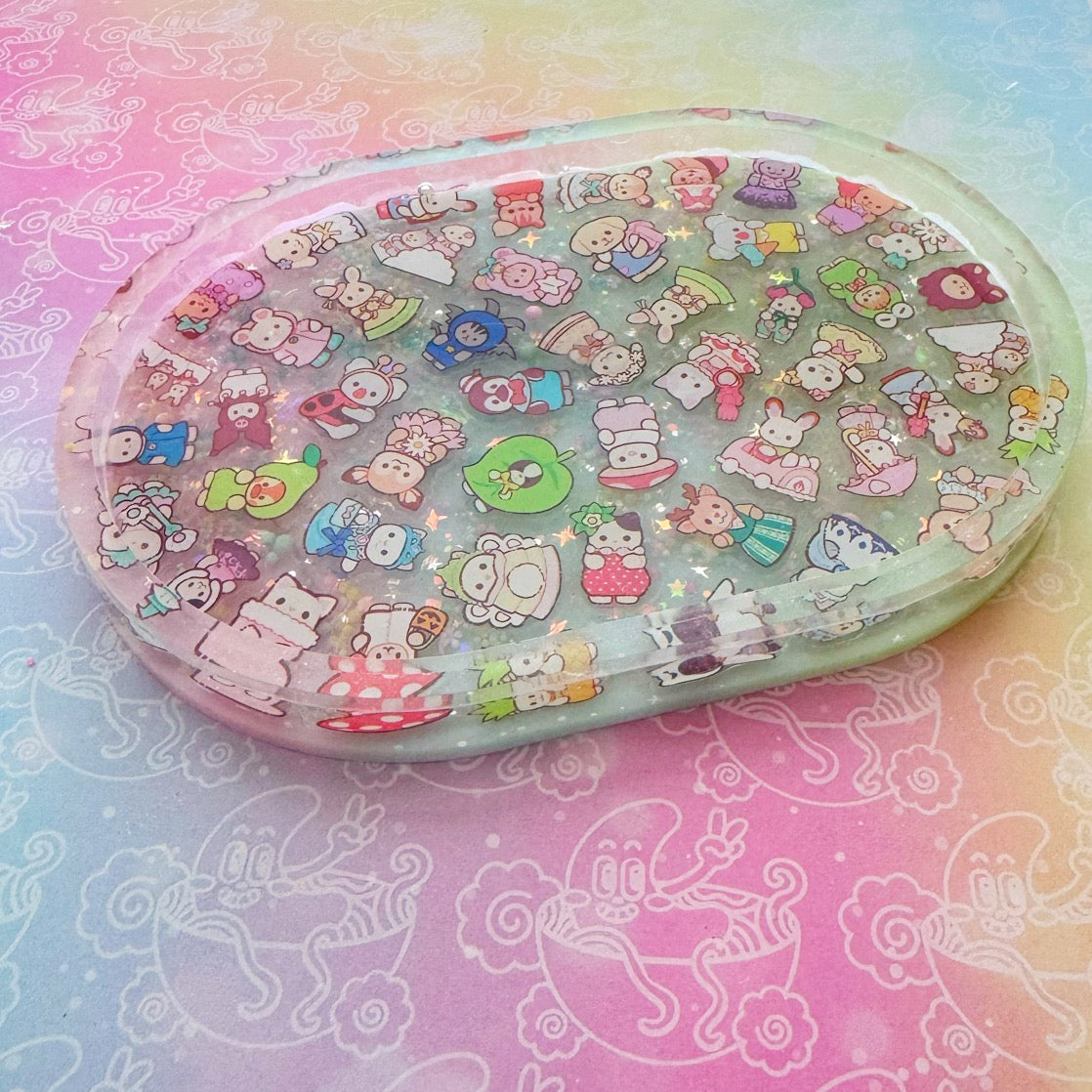 This is a resin tray that measures 4x4 inches. It is perfect for holding jewelry and knickknacks on side tables and dressers.